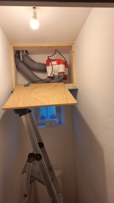 Dans l'impossibilité de poser le moteur dans les combles, La pose des gaines sous coffrage était la solution. Les trois pièces qui devaient être ventilées étaient au rez de chaussée attenantes les une avec les autres. Le tableau électrique également afin d'alimenter l'installation et de protéger le circuit avec un disjoncteur U+N C2 Ampére